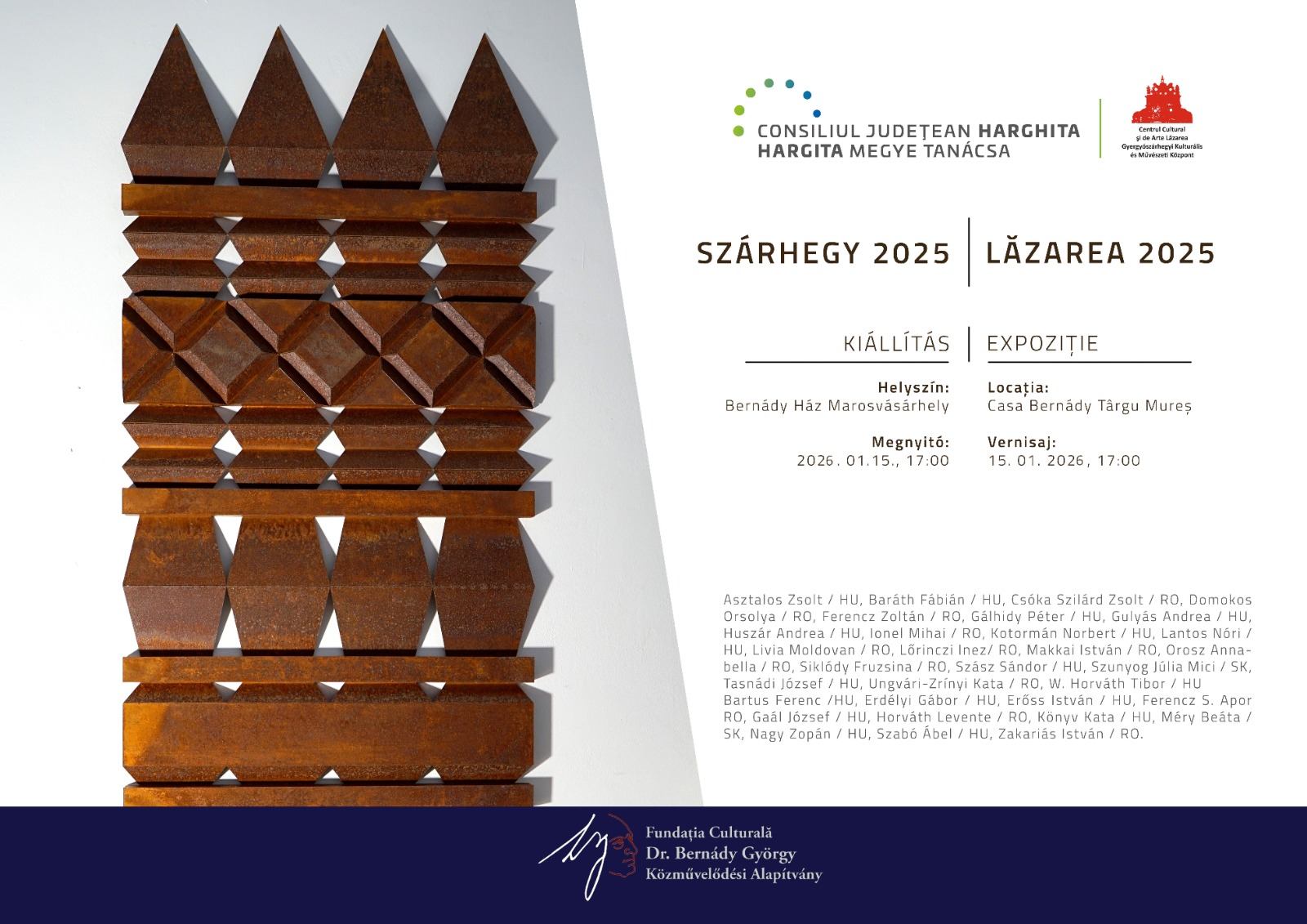 Január 15-én, csütörtökön 17 órától újra kettős eseménnyel nyitja éves rendezvényei sorát a marosvásárhelyi Bernády Ház. A Gyergyószárhegyi Kulturális és Művészeti Központtal kialakított hosszútávú kapcsolat folytatásaként a Művésztelep tavalyi alkotótáborainak terméséből nyílik kiállítás, és rangos díjátadóra is sor kerül. A szárhegyi központ által 2019-ben alapított Pro Cultura et Arte díjjal azoknak a romániai magyar kulturális újságíróknak a munkáját jutalmazzák, akik az írott sajtóban és az audiovizuális médiában megjelent anyagaikban kiemelten foglalkoznak az erdélyi és partiumi magyar kultúra és művészet tényszerű bemutatásával, népszerűsítésével. A GYKMK, a MÚRE valamint a Dr. Bernády György Közművelődési Alapítvány közös eseményét Kolcsár Béla, az elismerés kezdeményezője, Szűcs László, a MÚRE elnöke, Ferencz Zoltán, a Művésztelep művészeti vezetője valamint Nagy Miklós Kund, a BGYKA alelnöke méltatja.