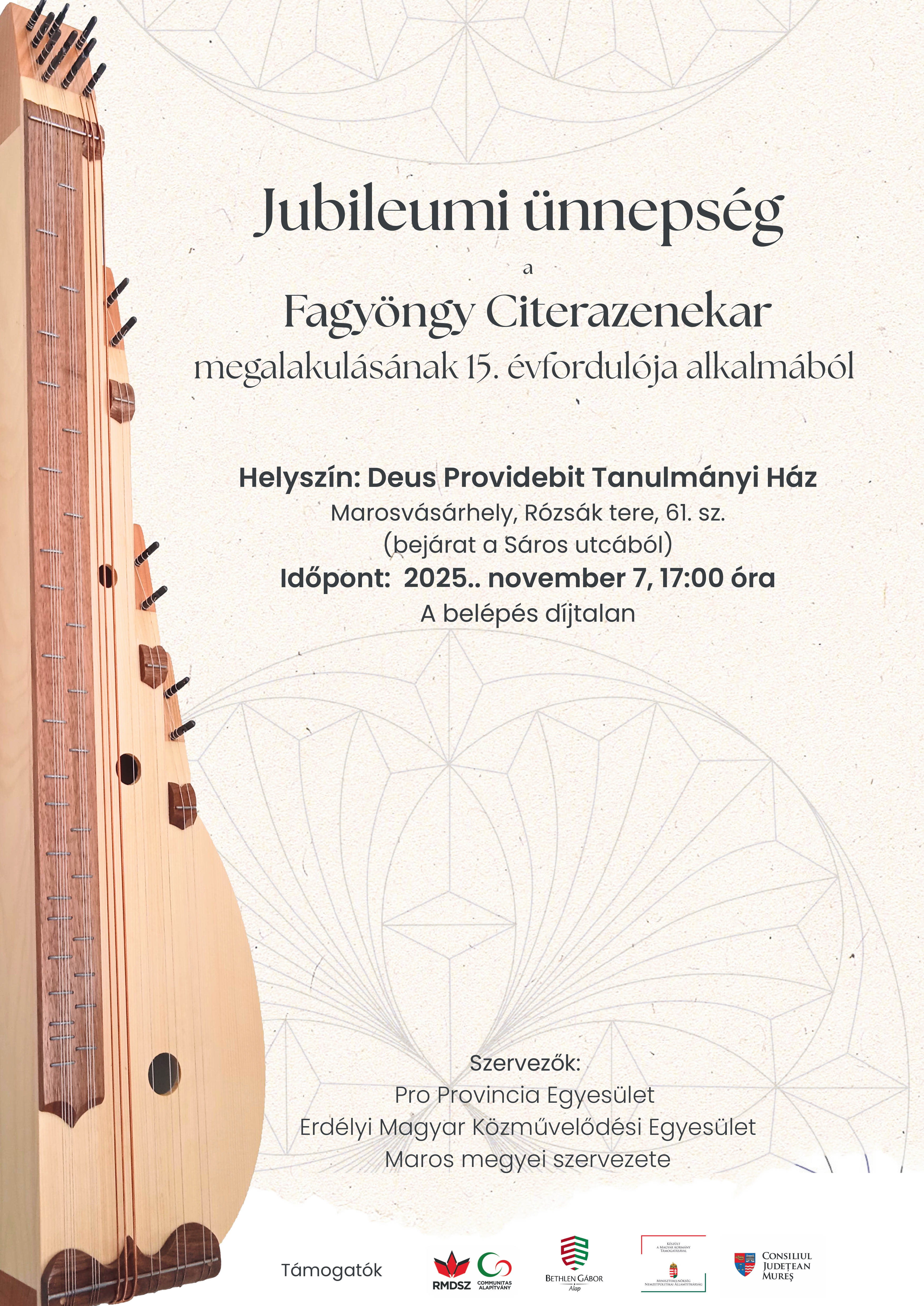 A Fagyöngy Citerazenekar 15 évvel ezelőtt alakult Marosvásárhelyen, az erdélyi magyar népzenei hagyományok ápolására és a citera közösségi megszólaltatásának erősítésére. A zenekar két Aranypáva Díj és egy Aranypáva Nagydíj birtokosa, valamit két CD lemez kiadója. Az ünnepségen fellépnek régi és jelenlegi tagok, vendég együttesek, valamint közös muzsikával idézzük fel az elmúlt évek legszebb pillanatait.